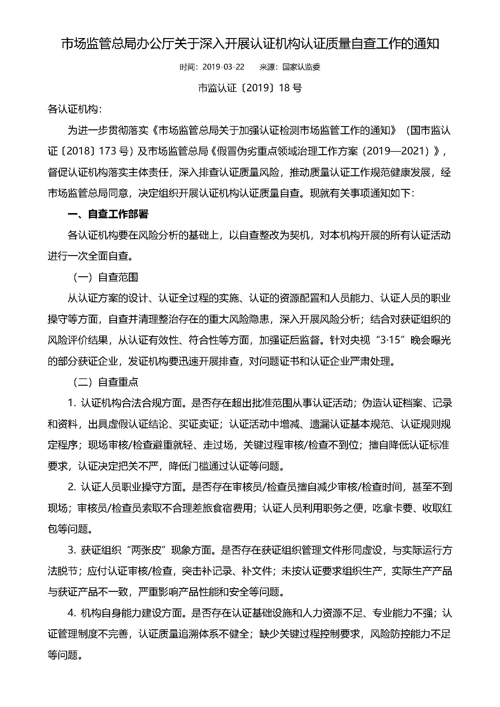 市場(chǎng)監(jiān)管總局辦公廳關(guān)于深入開(kāi)展認(rèn)證機(jī)構(gòu)認(rèn)證質(zhì)量自查工作的通知-市監(jiān)認(rèn)證2019-18號(hào)發(fā)表時(shí)間:2019年05月23日