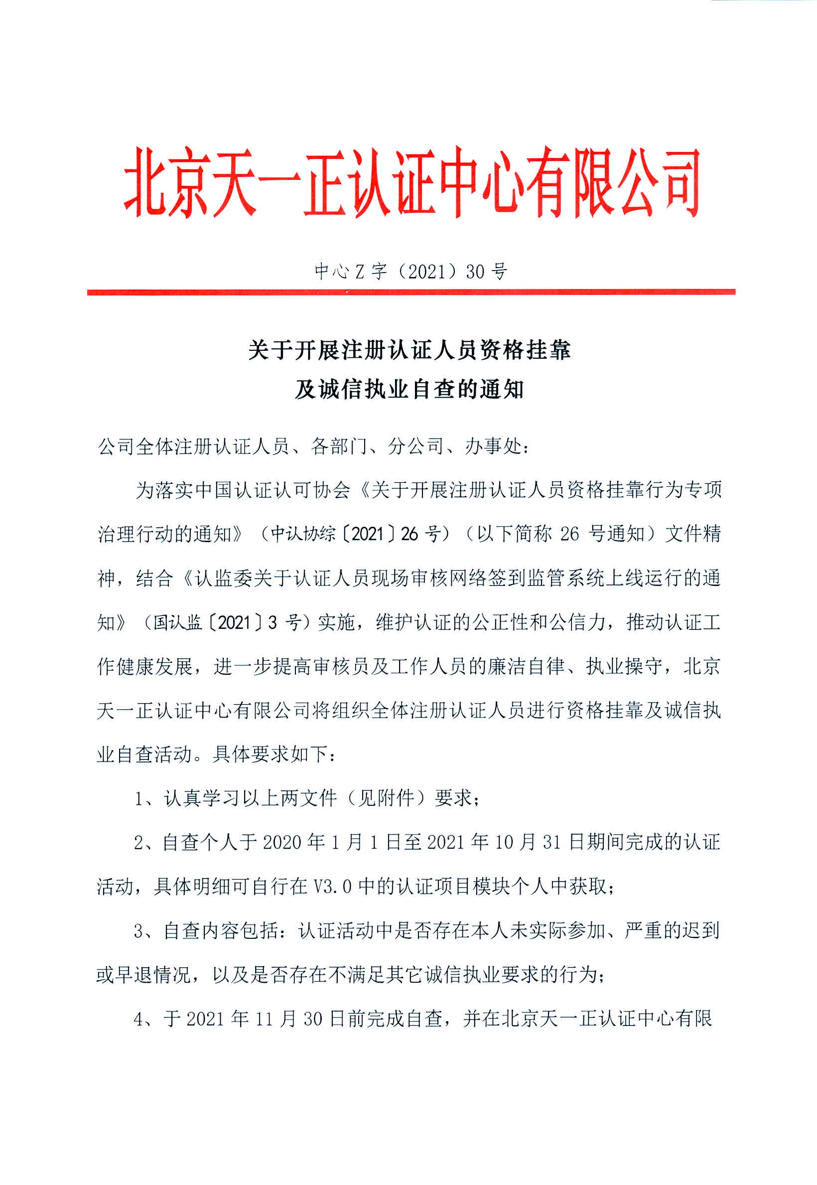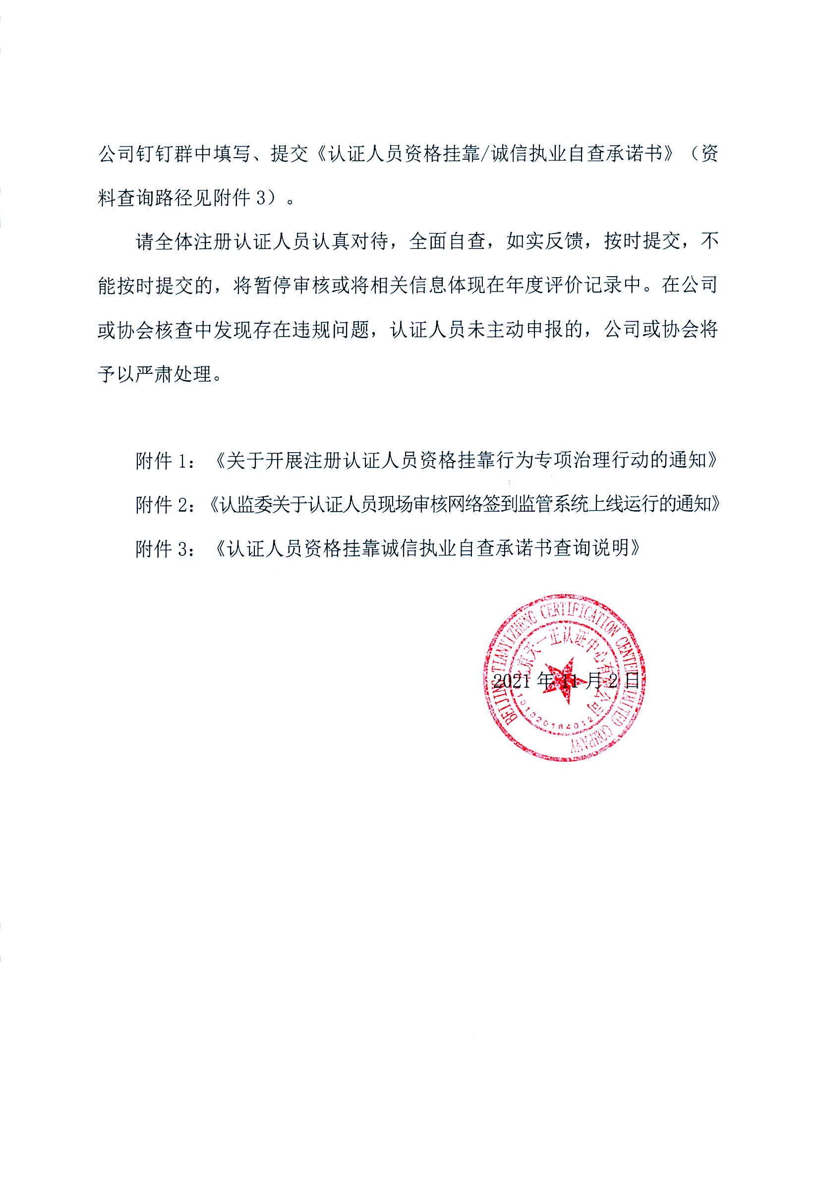 關于開展注冊認證人員資格掛靠及誠信執(zhí)業(yè)自查的通知發(fā)表時間:2021年11月03日