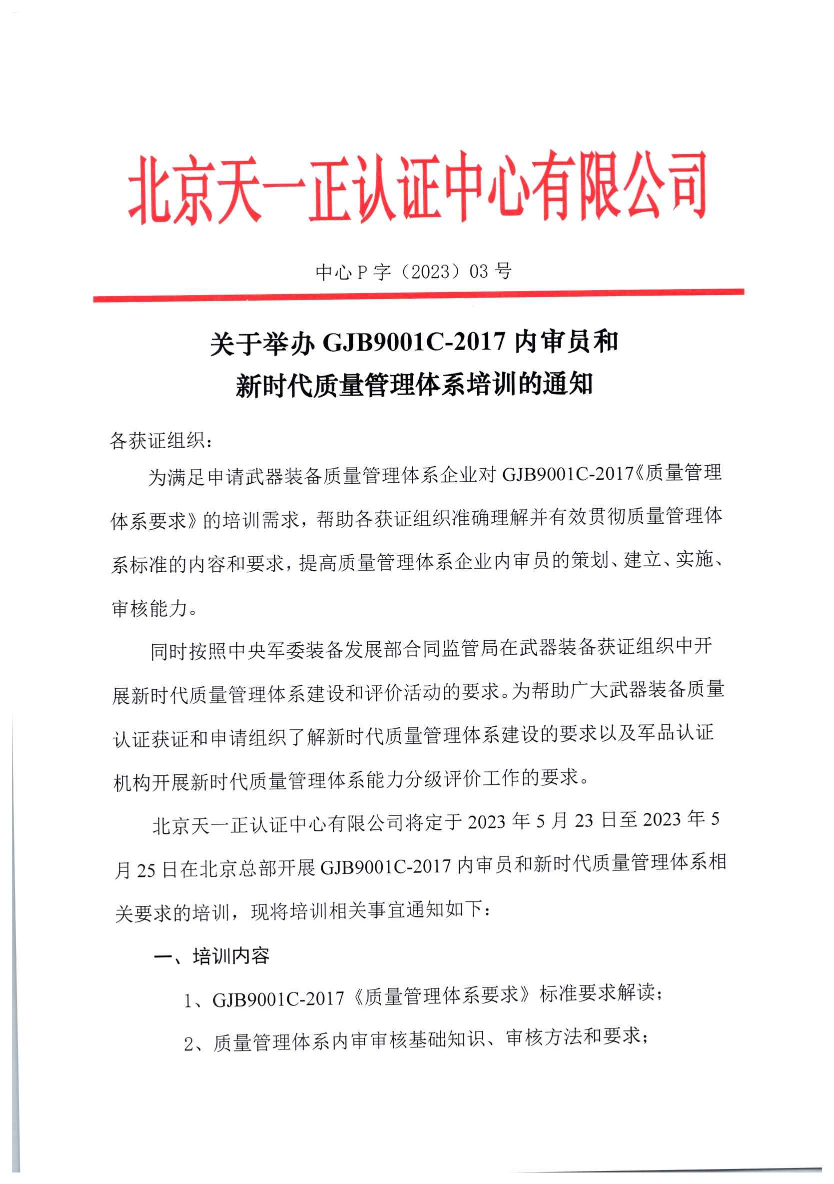 關(guān)于舉辦GJB9001C-2017內(nèi)審員和新時(shí)代質(zhì)量管理體系培訓(xùn)通知發(fā)表時(shí)間:2023年05月10日